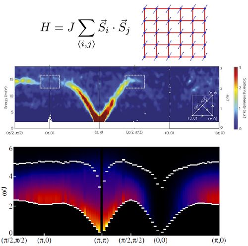 图 1. (上)二维方格子反铁磁海森堡模型与尼耳态。(中)Cu(DCOO)2.4D2O 材料的中子散射实验结果 [2],这个系统很好地实现了二维反铁磁海森堡模型,其自旋激发谱与(下)中的量子蒙特卡洛+随机解析延拓 (QMC+SAC) 结果 [1] 吻合;而且,在中子散射实验(中)和量子蒙特卡洛理论计算(下)里,系统的自旋激发谱在动量 (π,0) 附近都有连续谱出现。