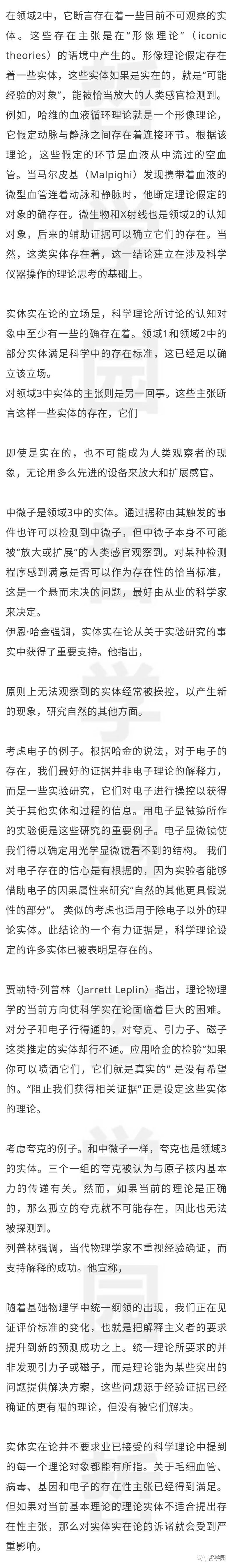 “收敛于真理”的论点也许不能令人信服。然而,还有其他方式为实在论辩护。特别是,有人也许会说,某些科学理论所假定的实体的确存在。可以提出有力的理由来支持“实体实在论”,反对“真理实在论”。罗姆·哈瑞(Rom Harré)分析了实体实在论针对三个认知对象领域所提出的主张。在领域1中,它断言存在着一些可观察的实体,例如火星、大西洋海沟、肾门静脉等。 这些主张可以通过较为简单的实验操作来判定。