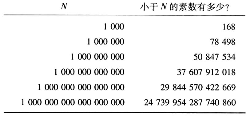 观察素数表,你会发现素数数目是下降的,它们越来越稀疏。1和100之间有25个素数,401和500之间有17个,而901和1000之间只有14个。如果把素数列到100万,最后一个百数段(就是从999901到1000000)中只有8个素数。如果列到10 000亿,最后一个百数段中将只有4个素数。它们是,999 999 999 937,999 999 999 959 ,999 999 999 961,999 999 999 989。