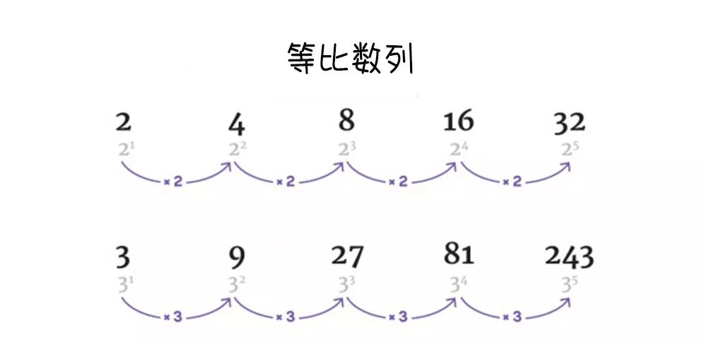 和等差数列有异曲同工之妙的是等比数列,这种模式是通过将一个数提高到越来越高的幂所形成的:3¹,3²,3³,3⁴。