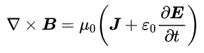 21方程四:安培-麦克斯韦定律讲完了磁生电的法拉第定律,我们麦克斯韦方程组就只剩最后一个电生磁的安培-麦克斯韦定律了。它描述的是电流和变化的电场如何产生旋涡状的感生磁场的,因为它电的来源有电流和变化的电场两项,所以它的形式也是最复杂的。方程的积分形式如下(具体过程见积分篇):左边的磁场的环流,右边是曲面包围的电流(带enc下标的I)和电场的变化率。它告诉我们,如果我们画一个曲面,通过这个曲面的电流和这个曲面里电通量的变化会在曲面的边界感生出一个旋涡状的磁场出来,这个旋涡状的磁场自然是用磁场的环流来描述。 可以想象,当我们用同样的方法把这个曲面缩小到无穷小的时候,如果我们在方程的左右两边都除以这个曲面的面积,那么方程的左边就成了磁场B的旋度▽×B,右边的两项除以一个面积会变成什么呢? 电通量的变化率除以面积之后就剩下电场的变化率∂E/∂t,这个跟法拉第定律的磁通量变化率除以面积类似。那么电流(带enc的I)那一项呢?电流I除以面积得到的东西是什么?这里我们定义了一个新的物理量:电流密度J。很显然,这个电流密度J就是电流除以电流通过的曲面的面积(注意不是体积)。相应的,电流密度的单位是A/m²(安培每平方米)而不是A/m³。 这样,麦克斯韦方程组的第四个方程——安培-麦克斯韦定律的微分形式就自然出来了:虽然还是有点长,但是相比积分形式已经是相当良心了,它告诉我们某一点感生磁场的旋度▽×B等于电流密度J和电场变化率∂E/∂t两项的叠加。其实它跟积分形式讲的都是一回事,都是在说电流和变化的电场能够产生一个磁场,只不过积分形式是针对一个曲面,而微分形式只是针对一个点而已。