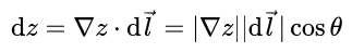 09梯度的性质这个梯度我们要怎么去看呢?首先▽z是一个矢量,是矢量就既有大小又有方向,我们先来看看梯度的方向。 上面我们已经得到了dz=▽z·dl,把dz表示成了两个矢量的点乘,那我们再根据矢量点乘的定义把它们展开,就可以写成这样:这个dz则表示山的高度的一个微小变化,那么,沿着哪个方向走这个变化是最快的呢?也就是说我选择哪个方向会使得dz的变化最大? Cosθ表示的是直角三角形里邻边和斜边的比值,而斜边总是比两个直角边大的,所以它的最大值只能取1(极限情况,θ=0°的时候),最小为0(θ=90°)。而根据上面的dz=|▽z||dl|cosθ,显然你要让dz取得最大值,就必须让cosθ取最大值1,也就是必须让▽z和dl这两个矢量的夹角θ=0°。 两个矢量的夹角等于0是什么意思?那就是这两个矢量的方向一样啊。也就是说:如果我们移动的方向(dl的方向)跟梯度▽z的方向一致的时候,dz的变化最大,我们高度变化最大。这就告诉我们:梯度▽z的方向就是高度变化最快的方向,就是山坡最陡的方向。假设你站在一个山坡上四处遥望,那个最陡的地方就是梯度的方向,如果你去测量这个方向的斜率,那这就是梯度的大小。所以,梯度这个名字还是非常形象的。