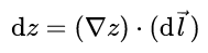 08梯度的诞生对于很多高中生来说,这只是一个熟悉得不能再熟悉的结论,但是我还是从头到尾给大家扎扎实实的推导了一遍。长尾科技不喜欢那种凭空突然冒出一个结论的感觉,所以我也希望读者看我的文章,每个结论得出来都是踏踏实实的,都是严密的逻辑推导出来的。这个式子有什么用呢?我们看看它的后面一半(带箭头的x,y表示矢量,对应上面公式里的黑体x,y):再对比一下我们上面推导出来的全微分定理:这个全微分定理的右边跟矢量点乘的右边是不是很像?都是两个量相乘然后把结果加起来。如果我们把dx看作x2,dy看作y2,两个偏导数看作x1和y1,那么我们就可以按照这个点乘的公式把这个全微分定理拆成两个矢量点乘的样子,即dz可以写成这样:于是,dz就被我们拆成了两个矢量点乘的样子,我们再来仔细看看这两个矢量:右边的这个矢量的两个分量分别是dx和dy,这分别是我沿着x轴和y轴分别移动无穷小的距离,它们相加的结果用dl来表示:而左边呢,左边这个矢量的两个分量分别是函数z=f(x,y)对x和y的两个偏导数,这个我们也用一个新的符号来表示它:绕了这么久,我们现在终于看到这个▽符号了,这个▽z的名字就叫:z的梯度。 把左右两边的矢量都单独拎出来之后,我们就可以把原来的式子写成更简单的样子:这一段信息量有点大,对于没接触过矢量分析的人来说可能会稍有不适。我们前面绕那么大弯子讲全微分dz,讲矢量的点乘,都是为了引出这个式子,然后从中提炼出梯度▽z的概念。不是很理解的朋友可以好好再看一看上面的文章,再想一下,长尾君基本上是从零开始一步一步写到这里来的,只要耐心看肯定能看懂~ 搞懂了这些事情的来龙去脉之后,我们就来重点看看我们引出来的▽z,也就是z的梯度。