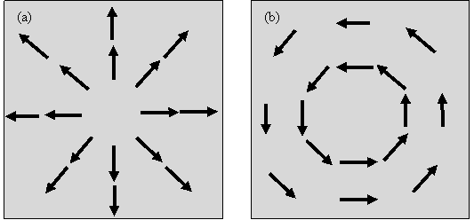 20旋度的几何意义我们知道旋度的定义是无穷小曲面的环流和面积的比值,但是它既然取了旋度这个名字,那么它跟旋转应该还是有点关系的。我们变化的磁场感生出来的电场也是一个旋涡状的电场。那么,是不是只要看起来像漩涡状的矢量场,它就一定有旋度呢?这个问题我们在讨论散度的时候也遇到过,很多初学者认为只要看起来发散的东西就是有散度的,然后我们通过分析知道这是不对的。一个点电荷产生静电场,只要在电荷处散度不为零的,在其他地方,虽然看起来是散开的,其实它的散度是零。如果我们放一个非常轻的橡皮筋在上面,除了电荷所在处,其它地方这个橡皮筋是不会被撑开的(即便会被冲走),所以其他地方的散度都为零。