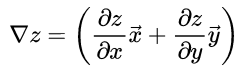 10▽算子我们再仔细看一下梯度▽z的表示:这是一个矢量,但是它看起来好像是▽和一个标量z“相乘”,我们把这个z提到括号的外面来,这时候这个梯度▽z就可以写成这样:所以,如果把▽单独拎出来,就得到了这样一个东西:这个东西就值得我们玩味了,这是啥?▽z表示的是二元函数z=f(x,y)的梯度,也就是说我们先有一个函数z,然后我们把这个▽往函数z前面一放,我们就得到z的梯度。从函数z得到z的梯度的具体过程就是对这个函数z分别求x的偏导和y的偏导。 也就是说,单独的▽是这么个东西:我▽自己本身并不是什么具体的东西,我需要你给我一个函数,然后我对你这个函数进行一顿操作(求x和y的偏导),最后返回一个这个函数的梯度给你。这就像是有一个特定功能的模具:你给我一堆面粉,我一顿处理之后返回你一个饼。但是显然的,它并不是面粉,也不是饼,它单独的存在没有什么意义,它一定要跟面粉结合才能产生有具体意义的东西。这种东西叫算子,▽就叫▽算子。基于▽算子的巨大影响力,它又有一大堆其他的名字:从它的具体功能上来看,它被称为矢量微分算子;因为它是哈密顿引入进来的,所以它又被称为哈密顿算子;从读音上来说,它又被称为nabla算子或者del算子。这些大家了解一下,知道其他人在谈论这个的时候都是在指▽算子就行了。