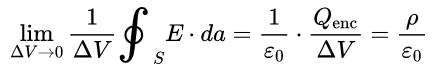 说了这么多,又是证明不同散度形式(无穷小曲面的通量和▽·)的等价性,又是说明不同散度理解方式的同一性(无穷小曲面的通量和散开的程度),都是为了让大家从更多的维度全方位的理解散度的概念,尽量避开初学者学习散度会遇到的各种坑。理解了这个散度的概念之后,我们再来看麦克斯韦方程组的第一个方程——高斯电场定律的微分形式就非常容易理解了:方程的左边▽·E表示电场在某一点的散度,方程右边表示电荷密度ρ和真空介电常数的比值。为什么右边要用电荷密度ρ而不是电荷量Q呢?因为散度是无穷小曲面的通量跟体积的比值,所以我们的电量也要除以体积,电量Q和体积V的比值就是电荷密度ρ。对比一下它的积分形式:两边都除以一个体积V,然后曲面缩小到无穷小:左边的通量就变成了电场的散度▽·E,右边的电荷量Q就变成了电荷密度ρ,完美! 麦克斯韦方程组的积分形式和微分形式是一一对应的,理解这种对应的关键就是理解散度(和后面的旋度)这两种不同定义方式背后的一致性,它是沟通积分和微分形式的桥梁。理解了它们,我们就能在这两种形式的切换之间如鱼得水,我们就能一看到积分形式就能写出对应的微分形式,反之亦然。