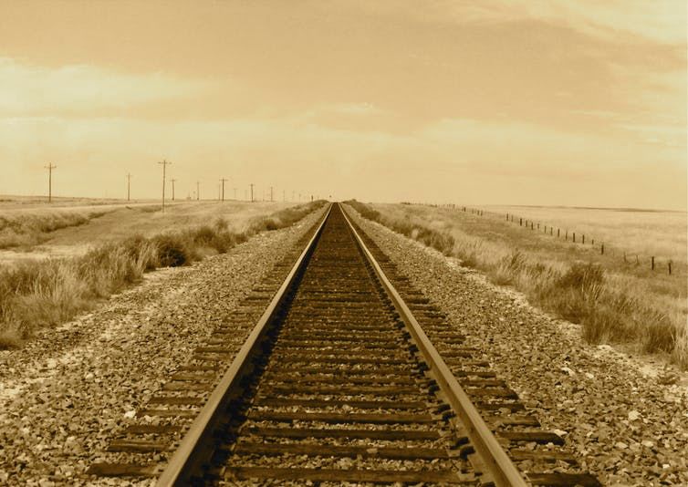 ○ 这条轨道实际上从未相交,但随着它们向地平线靠近,似乎它们会在一个遥远的“消失点”上汇合。| 图片来源:royluck / flickr