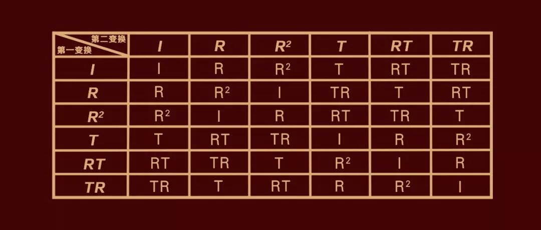 将它们一一列入表中,让第一列中的对称变换与第一行中的对称变化进行组合,比如当第一变换是R²(逆时针120°旋转两次),第二变换是TR(逆时针旋转120°接翻转)时,那么R²与TR的组合会得到TRR²,而RR²=R³=I,所以TRR²组合等价于T。