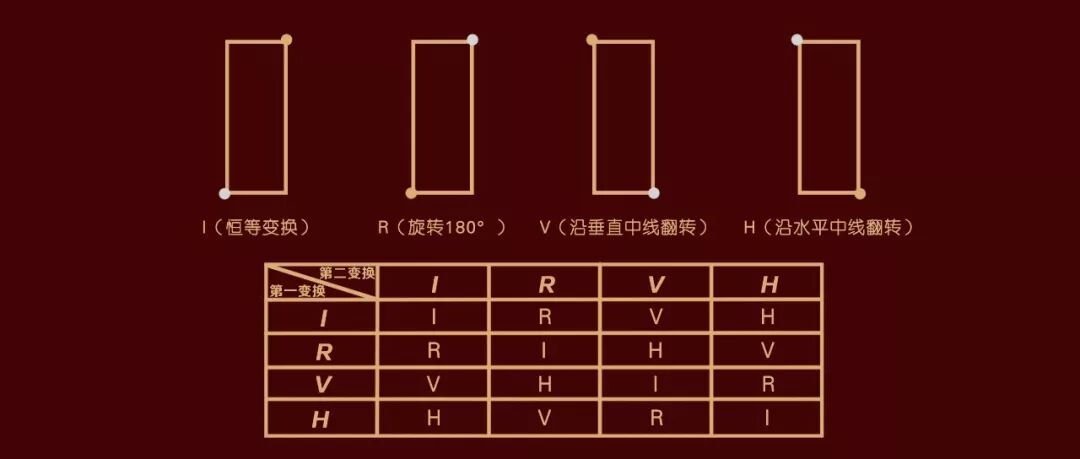 在完成一种对称变换后再进行的另一种对称变换,这种组合结果也必然是一种对称变换。比如先做旋转变换R,再做翻转变换T,那么经过这个过程(写作TR)将得到