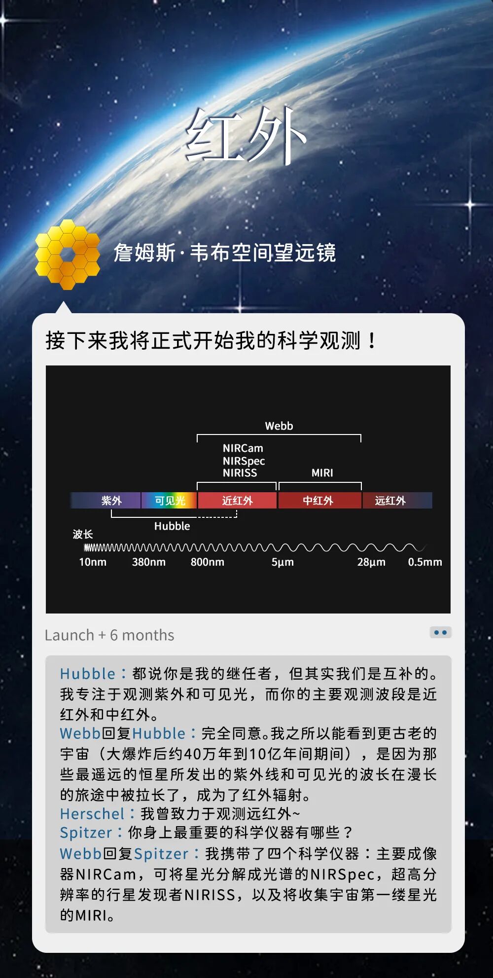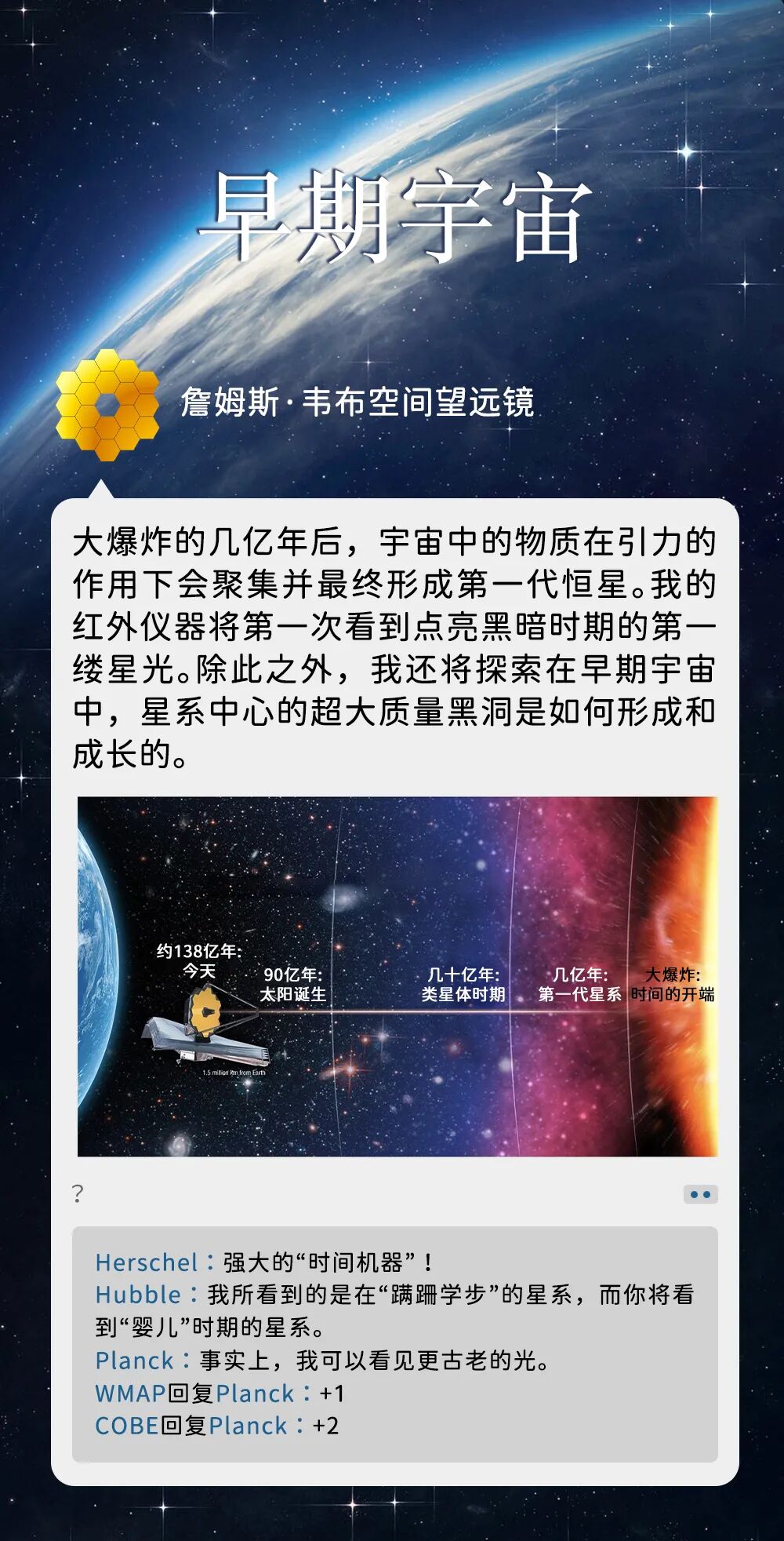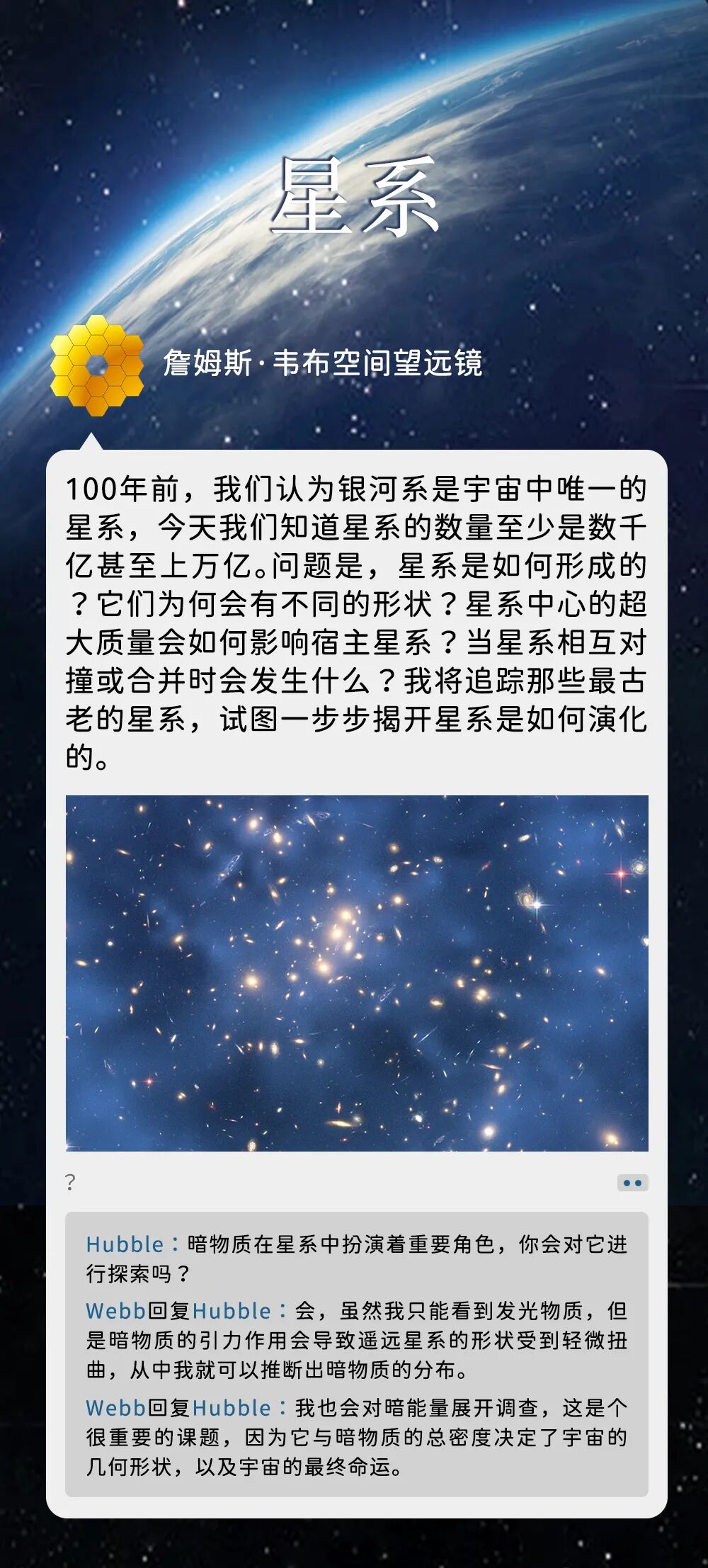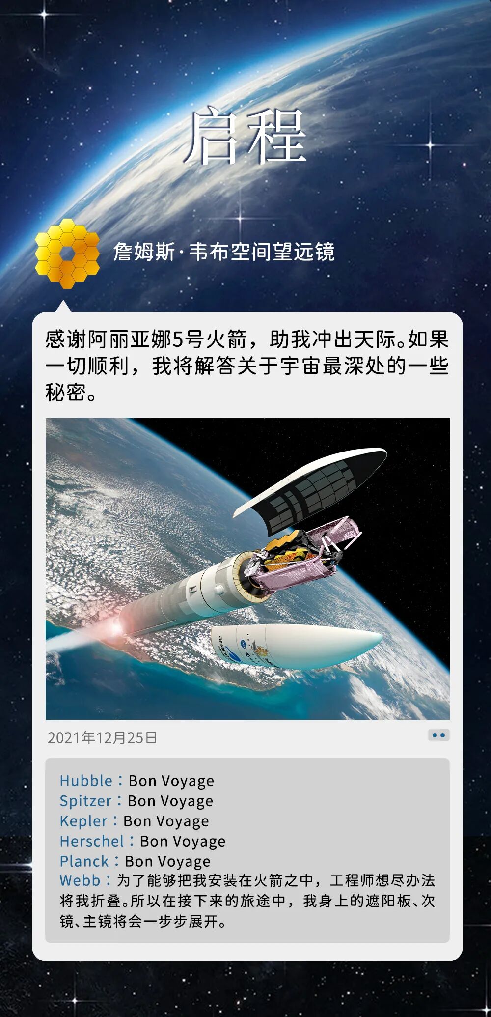 https://jwst.nasa.govhttps://webbtelescope.org#图片来源:封面图:ESA/ATG medialab首图:ESA哈勃眼中的宇宙:https://www.esa.int/ESA_Multimedia/Images/2020/04/Thirty_years_of_Hubble_Space_Telescope科学目标:第一批恒星(N. R. Fuller/National Science Foundation)、黑洞(ESO/M.Kornmesser)、恒星演化(NASA)、系外行星(NASA & JPL/Caltech)、太阳系(Wikimedia Commons)启程:ESA/D.Ducros