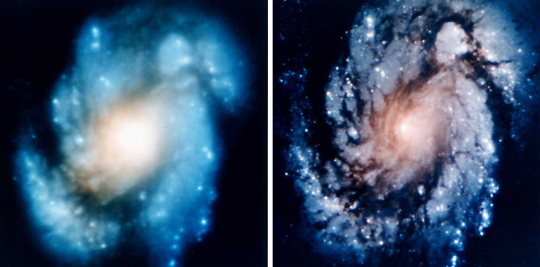 1993年12月,宇航员在HST的主镜上安装了校准透镜。图中显示的是M100星系在校准前后的照片对比。