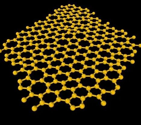 如果仔细观察单层平面,也就是非晶石墨烯,它们并不是那种构成理想石墨烯的完美六边形的层。这种新材料中包含了大量的六边形,但也有五边形和七边形。