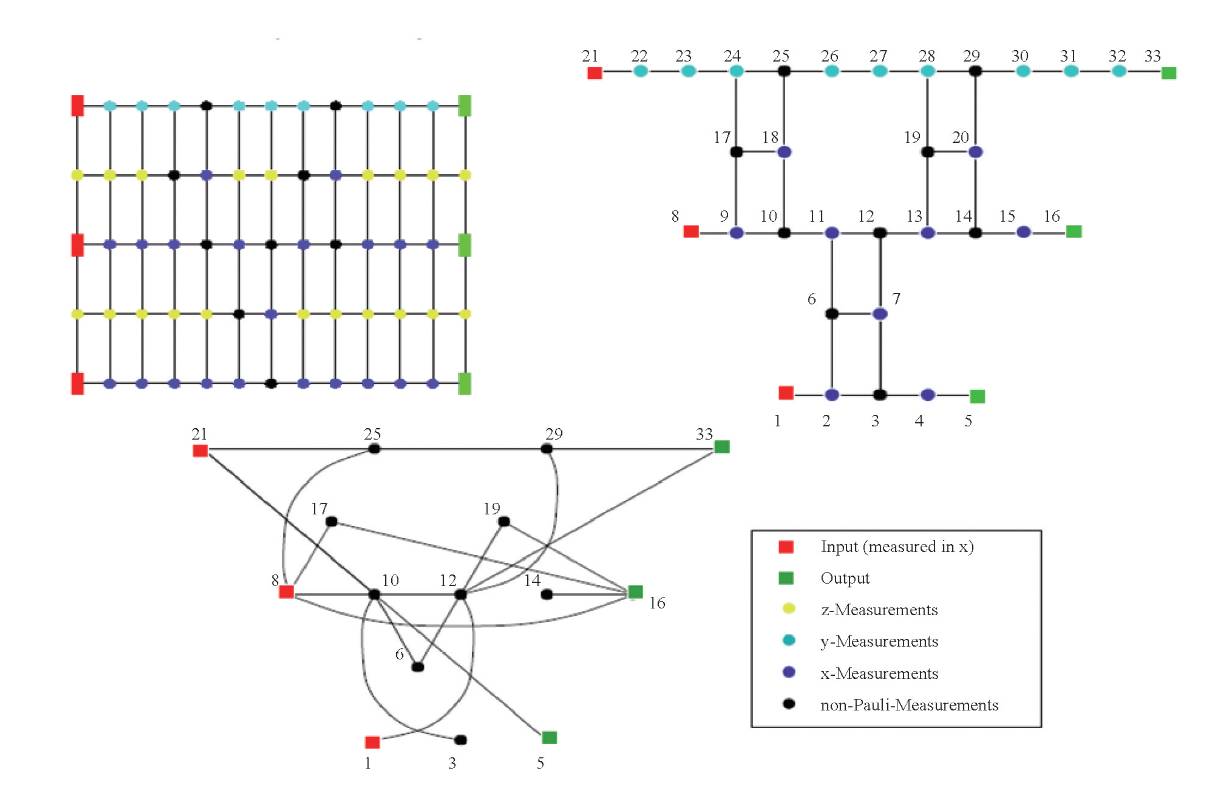 量子计算的超强能力来自于量子态的超经典关联特性。如果能够大规模的制备拥有某种纠缠特性的量子态,就可以通过简单的单比特测量来实现普适的量子计算。这种有别于经典计算模式的计算方式称为One-way量子计算或基于测量的量子计算[9]。一般而言,使用具有某种拓扑结构(比如二维方格)的图态来实现普适的量子计算(并非任意图态都能实现普适量子计算,例如一维的图态就不适用)。图态本身具有某些非常好的量子特性,比如经过局域的测量之后,剩下的部分仍然是一个图态(可能需要做局域转动才会变成标准图态)。单比特测量的测量方式会依赖于前面其他单比特测量的结果。如果仅仅使用Clifford测量(例如Pauli算符测量),One-way量子计算的计算能力与经典计算机能力相当,无法完成普适的量子计算。非Clifford的测量在实现量子优越性的过程中起着关键性的作用。因而在实现量子计算的过程中,为了减少量子比特的数目,可以把Clifford测量的效果进一步编码到多体量子态的制备中去,图2显示了该计算过程。One-way量子计算是量子计算所特有的计算模型,对理解量子计算过程有非常好的作用。