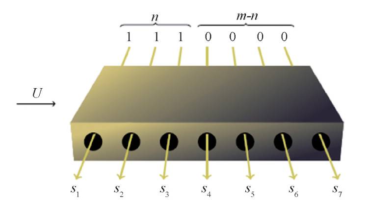 尽管各个系统都取得了巨大进展,实现普适的容错量子计算仍然超出了现阶段的技术能力。那么在现有的技术条件下,是否可以体现量子计算的巨大威力?对某些特定的问题,并不需要量子编码过程,只需要几十个物理比特量子计算机(准确的说是专为解决具体问题而构建的量子模拟器,还不是普适的量子计算机)就可以超越现在的超级计算机的能力,这就是近期备受关注的量子霸权。玻色取样问题就是一个这样的问题。玻色取样问题可以描述如下[36-37]:给定m个输入模式,n 个输入光子(n<m)(图4),一个系统的幺正演化算符U,求这个装置的输出分布取样。