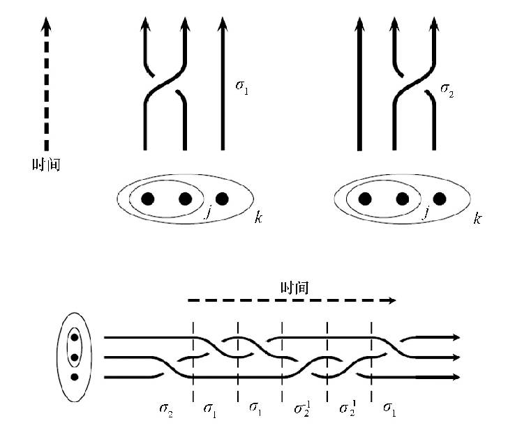 拓扑量子计算模型也是量子计算中一个非常有意思的模型。在二维量子系统中,存在一种被称之为非阿贝尔统计的任意子,如果2个任意子之间进行了一次交换,它们的整体波函数就会做一个幺正变换。如果这种任意子还满足某种类型(比如Fabonacci型)[11],那么通过交换不同的任意子就可以实现普适的量子计算(图3示意通过Braiding来实现拓扑量子计算的过程)[11]。由于任意子统计本身的拓扑性质,这样实现的量子计算天然具有对噪声的免疫性,是实现量子计算的理想载体。从这一模型出发,还可以直接的将量子计算与拓扑分类研究相联系[12],比如可以直接利用量子计算得到Jones多项式的一些值,进而可以研究拓扑分类。然而,要实现和操控这样的非阿贝尔任意子还远远超出了现阶段在固态系统中的能力。最有可能在实验中实现的非阿贝尔任意子是马约拉那任意子[13],但它的交换并不能实现普适的量子计算[14]。