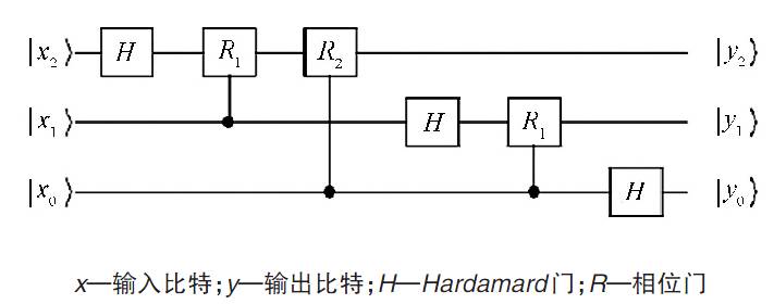 量子线路模型是和经典线路并行的模型,无论是它使用的语言还是构造方法都和经典计算相似,只需要将经典的逻辑门换成量子的逻辑门即可。一般来说,一个量子计算的过程,可以表示成整体系统的幺正变换(中间无测量,测量放到最后)。可以证明,任意系统的幺正变换都可以表示成两比特受控非门(CNOT)和单比特旋转门生成的组合,这个组合过程就是量子线路。所以,从量子线路的角度来看,只要能实现完美的两比特受控非门和任意的单比特旋转就可以实现普适的量子计算。不同的量子算法,对应于不同的量子线路,如图1 表示实现3 量子比特的量子傅里叶变换的线路图。量子线路模型的优点是可以借鉴经典计算线路的思想、概念和经验来设计新的量子算法。