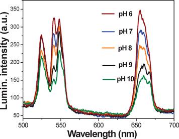 研究人员设计并制备了一种带有稀土离子铒的薄膜材料,具备对pH传感能力,传感效果如图4所示:随着pH数值从6上升至10,上转换荧光发射强度的衰减明显,通过对发射强度的计算可以用于检测pH值,由此可以实现对pH的传感应用[2]。