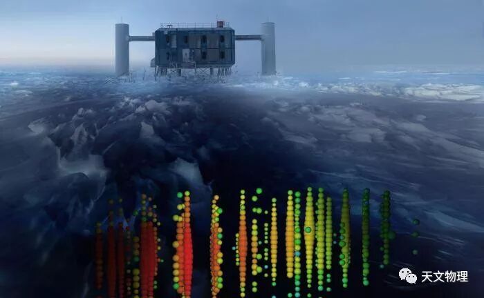 这张图片展示了在南极冰立方实验室的视野中,最高能量中微子探测的一个可视化表示概念图。图片版权:IceCube Collaboration