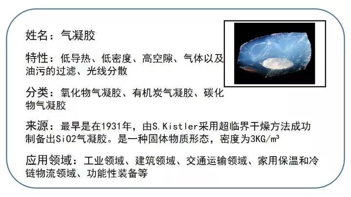 气凝胶不同于我们传统思维中的“胶”,它是一种固体物质形态,密度为3KG/m³,因其密度极低,所以也被叫做“冻结的烟”或“蓝烟”。也因为其体内80%的空气组成所以有非常好的隔热效果,一寸厚的气凝胶相当20至30块普通玻璃的隔热功能。