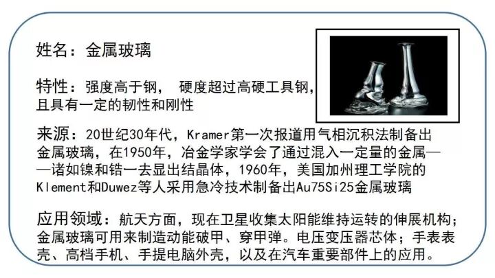 一说到玻璃,大众的反应是玻璃板,易碎。但是在科学家眼里,玻璃是任何能从液体冷却成固体而无结晶的材料。大多数金属冷却时就结晶,原子排列成有规则的形式称作晶格。如果不发生结晶并且原子依然排列不规则,就形成金属玻璃