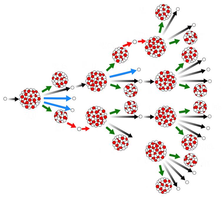 ○ 链式核反应。绿色箭头显示了铀核在两个裂变碎片中的分裂,放射出新的中子。一部分中子能诱发新的裂变反应(黑色箭头),还有一部分中子可能在其他过程中丢失(蓝色箭头)。红色箭头显示从放射性裂变碎片中产生的能诱发新裂变反应的缓发中子。 | 图片来源: MikeRun modified by Erin O’Donnell, MSU, CC BY-SA