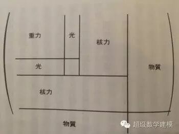 他们发现,在一个十一维的度量张量模型里,包含了自然界里几乎所有的粒子与作用力:爱因斯坦的重力理论、杨-米场与麦克斯韦尔场、还有夸克与轻子。如图所示: