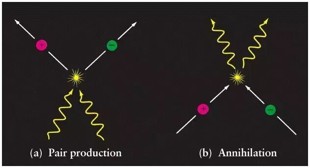 (a)成对产生:光子相遇时会产生一个粒子和一个反粒子;(b)湮灭:当一个粒子和反粒子相遇会通过光子的形式释放能量。(© Dmitri Pogosyan)