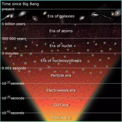 宇宙的不同时期,包括下文会提到的最早期的普朗克时期,以及之后的大统一时期和电弱时期。(© ESA)