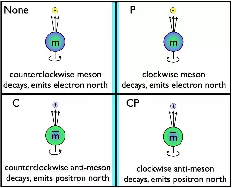 一个逆时针转的介子(左上)衰变并往北射出电子。在P变换下(右上),介子顺时针衰变并往北射出电子;在C变换下(左下),逆时针转的反介子衰变并往北射出电子;在CP联合变化下(右下),该粒子变成顺时针的反介子衰变,并往北射出电子。(© E. Siegel)