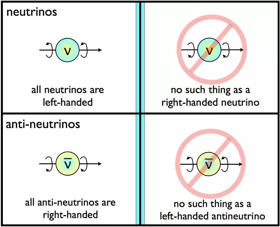 弱相互作用破坏电荷共轭不变性:所有的中微子都是左手的,没有右手中微子的存在。所有的反中微子都是右手的,没有左手的反中微子存在。(© E. Siegel)