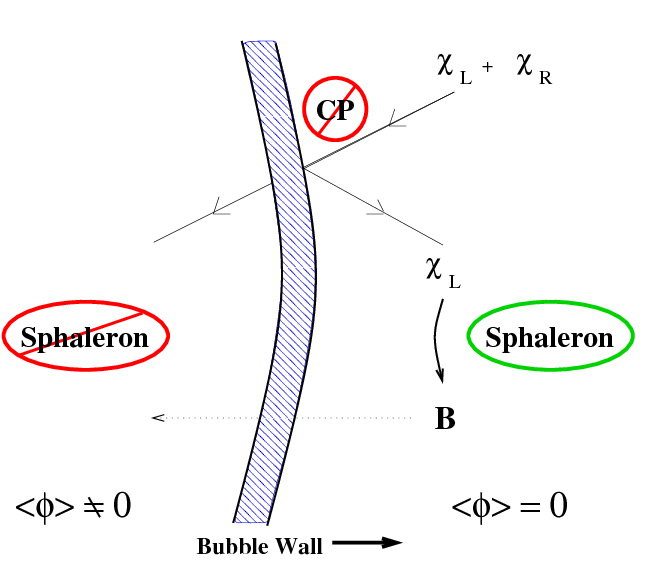 2. 电弱重子数产生机制(Electroweak baryogenesis, EWBG):这是解释宇宙中重子不对称最具有吸引力和前景的理论之一。从名字就可以猜出,EWBG是指任何在宇宙早期电弱相变时期产生的重子密度不对称的机制,但只有在EWSB是一级相变的情况,类似水分蒸发。在空间中,布满了一个场的能量泡,这个场就是希格斯场。在能量泡外的空间的反轻子会通过sphaleron过程转化成重子。而在泡里面的空间就不会。从希格斯的质量我们知道,EWSB的温度过低不足以产生一级相变。但是,如果在高能下我们能够找到类似希格斯的粒子,这个理论就是可行的。