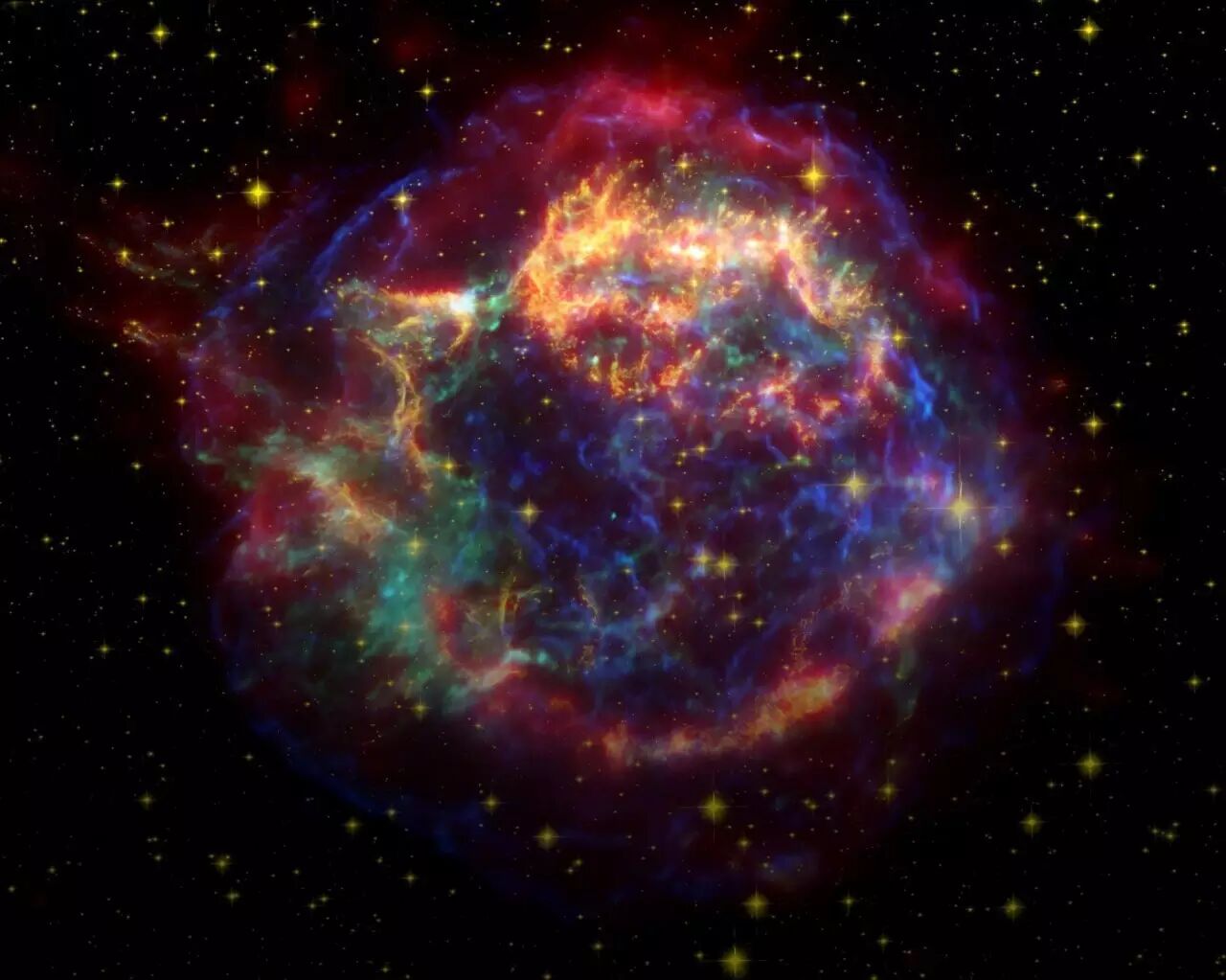 仙后座A超新星遗迹。(© NASA/JPL-Caltech; Chandra/Spitzer)