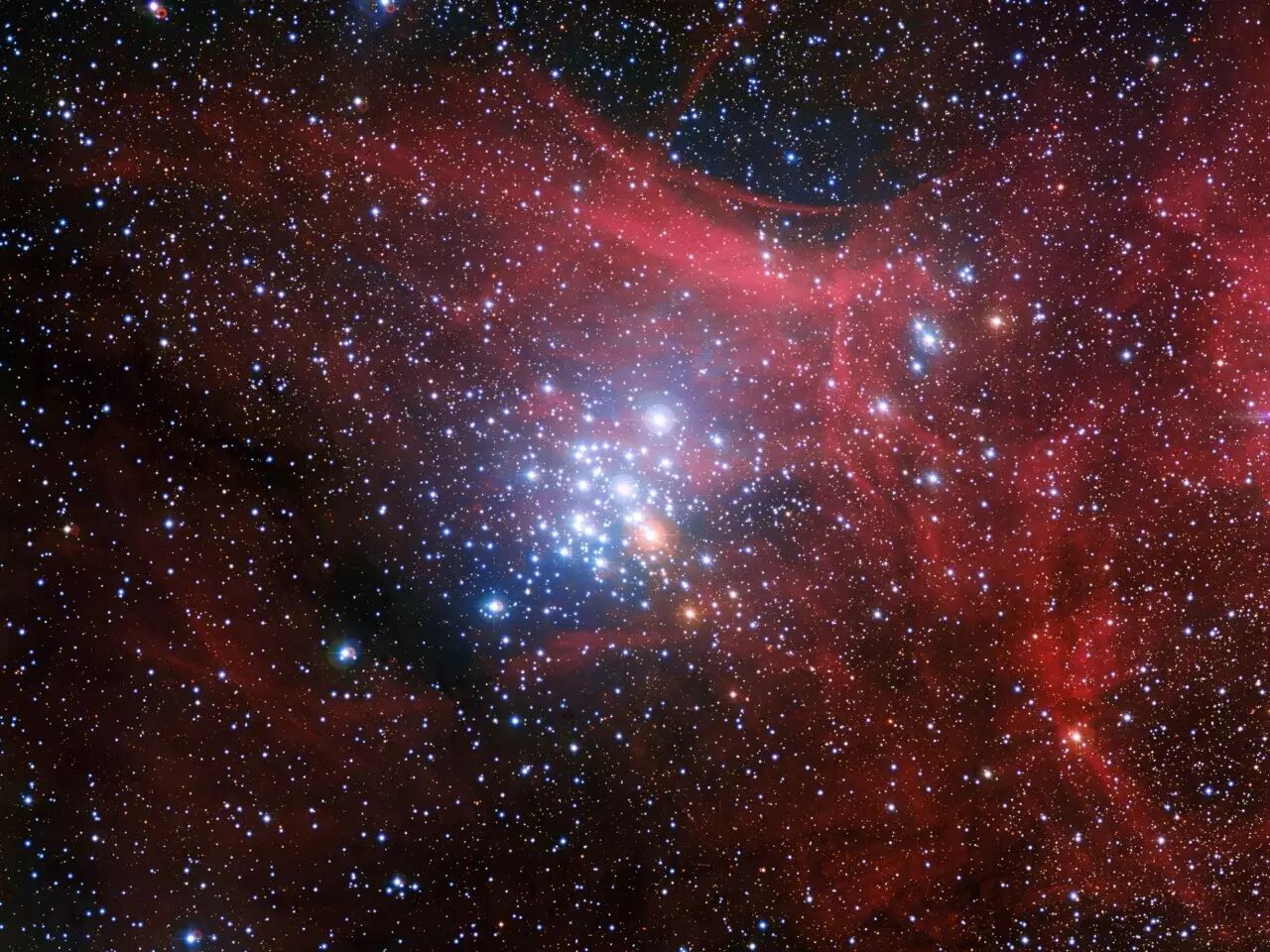 一个新恒星团,充满了明亮、巨大的恒星,在它们核心会产生大量的碳。(© ESO)