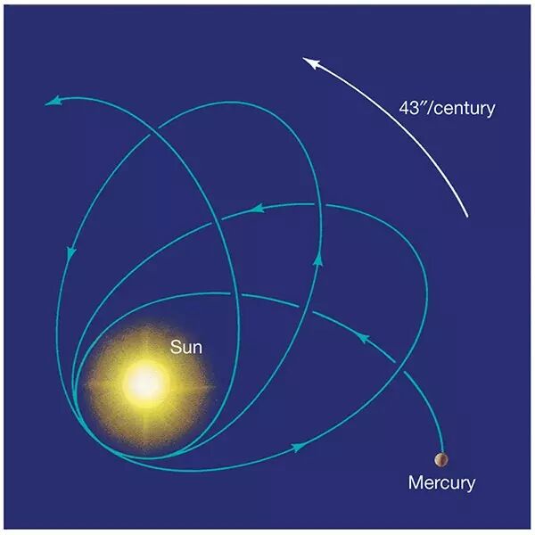 1859年,勒维耶发现,当水星运行到离太阳最近的地方,也就是近日点,它的实际轨道和牛顿力学所预测的有所偏差。这也就是所谓的水星近日点进动,进动的偏差并不多,每世纪相差43弧秒。
