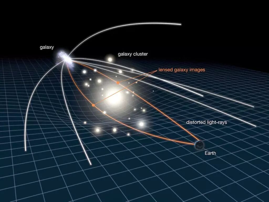由于时空在大质量天体附近发生了扭曲,使光线在天体附近发生弯曲,这个现象被称之为"引力透镜",是探测宇宙的一个重要"工具"。比如一个巨大的星团可以放大遥远的原初星系,提供了一个窥探早期宇宙的重要途径。