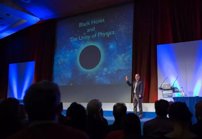 最后,附上小编参加的一个广义相对论100周年的庆祝的照片。原计划是霍金会出席演讲,但由于霍金身体因此无法出席。