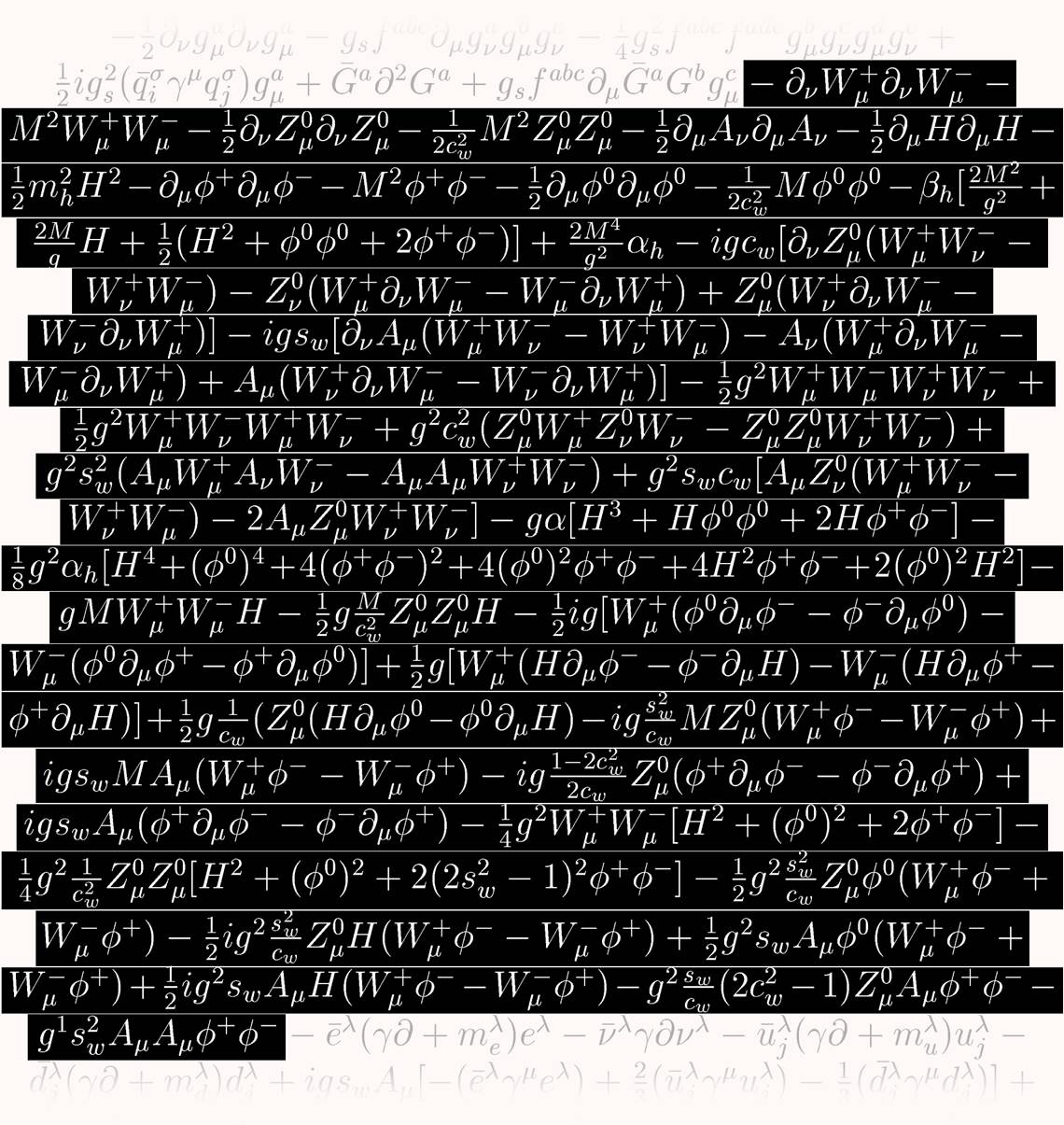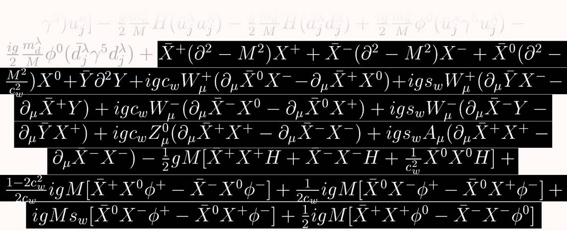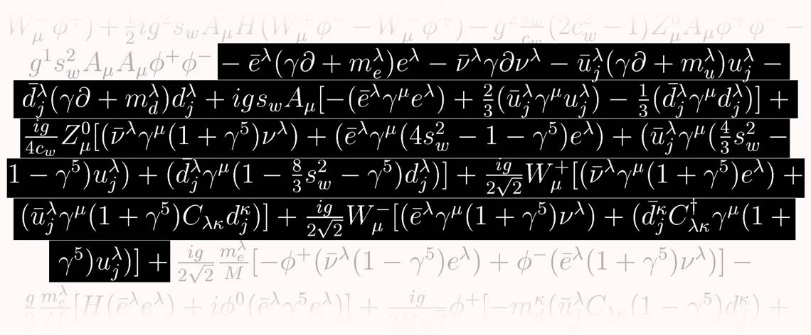 【注】Thomas Gutierrez是从诺贝尔得住Martinus Veltman的《Diagrammatica》一书中推导出这个方程的。他花了将近四个小时的时间才用Latex打写了整个方程。但是他后来发现这个方程中有一处符号错误,不过相信你也不会愿意去找。