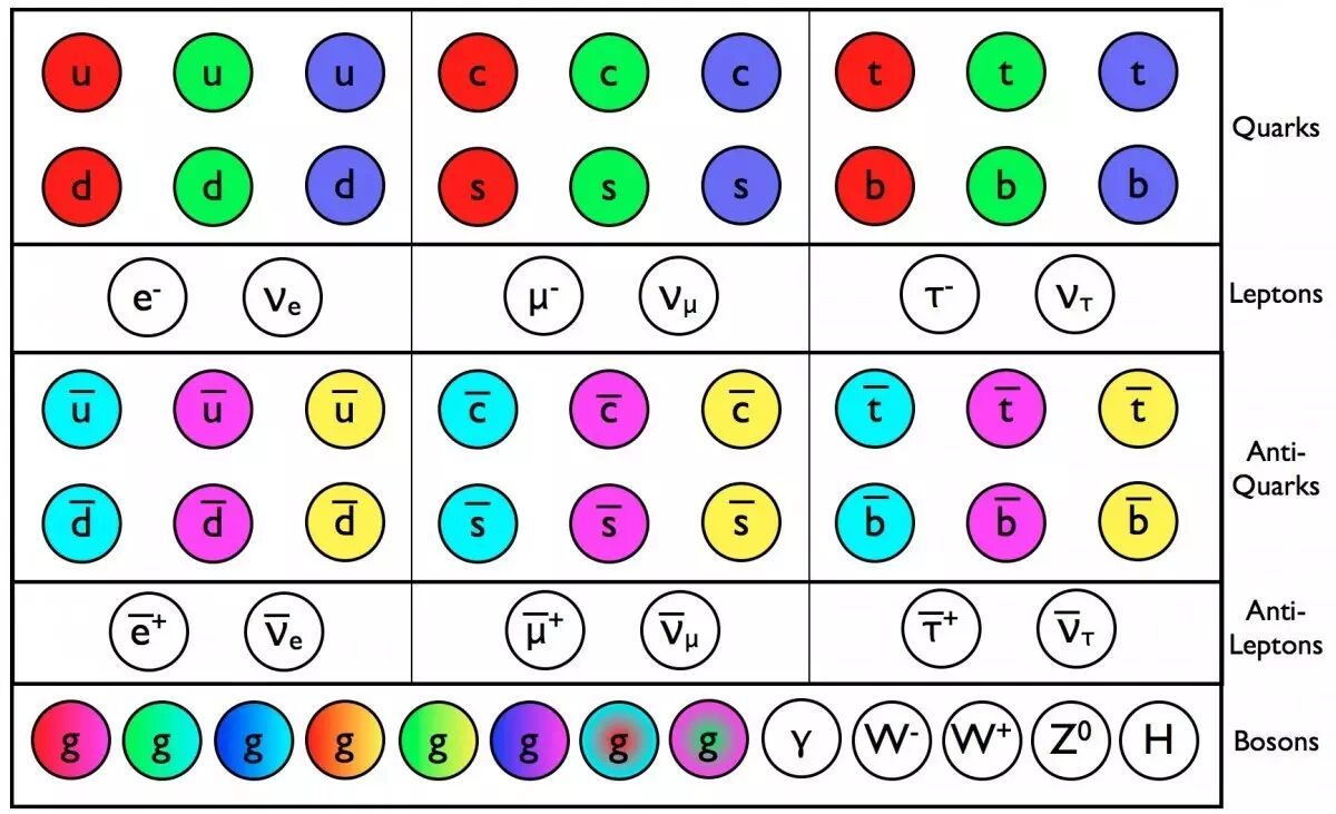 粒子物理学的标准模型中的所有基本粒子:夸克、轻子、反夸克、反轻子和玻色子。(© E. Siegel)