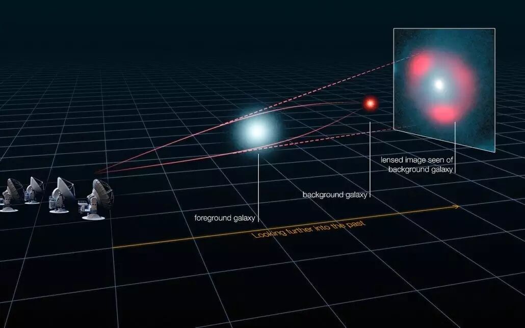 △ 遥远的背景星系发出的光线在经过离我们较近的星系时,光线会被弯曲,这会导致我们看到多个影像。(图片来源: ALMA (ESO/NRAO/NAOJ), L. CALÇADA (ESO), Y. HEZAVEH ET AL.)