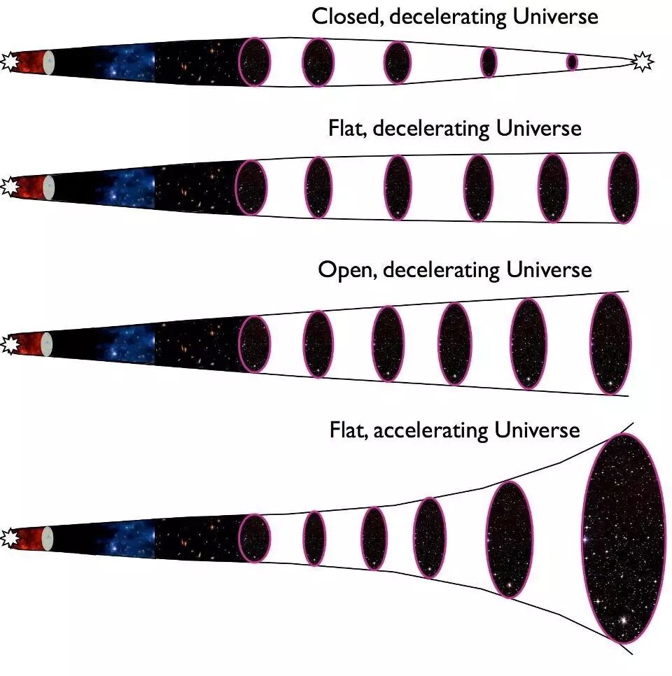 △ 宇宙的四个可能命运,最后一个跟现有观测数据符合的最好:被暗能量统治的宇宙。(图片来源:E.Siegel)