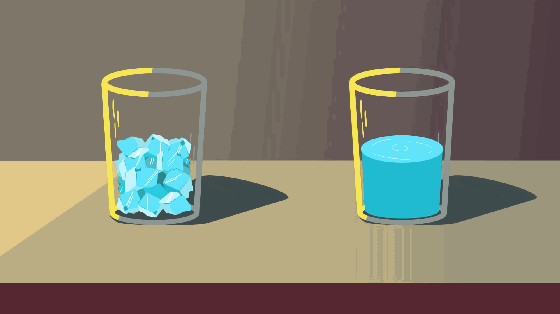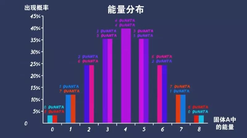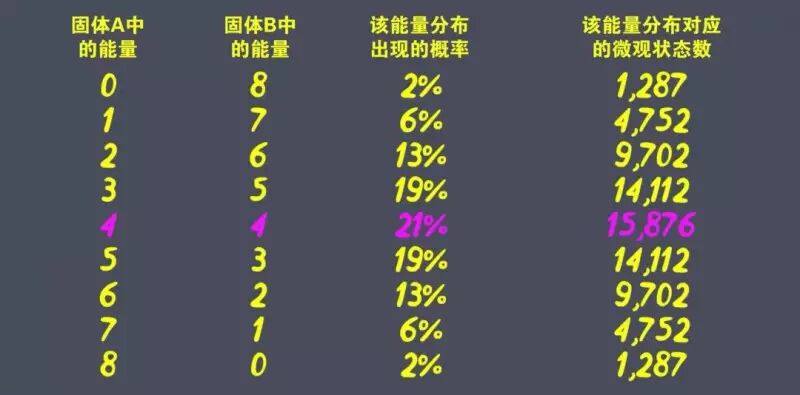 为什么冰受热会融化? 为什么咖啡中的奶油会溶解? 为什么被戳破的轮胎会漏气? 为什么一些物理或化学的过程 会朝着特定的方向进行? 这一切都要用 熵 这个概念来解释 我们在高中物理里就学过 熵是用来描述一个系统 混乱程度的物理量 一些教科书上甚至还给出了公式 S=k lnΩ 但是公式里的Ω究竟是什么含义 混乱程度怎么去定量描述 很多人一直都没有搞清楚 如果我有两个杯子 一杯里装了碎冰块 一杯里装了白开水 两者的质量相等 你能告诉我哪一杯的混乱程度更大 或者说是熵更大吗? 我相信很多人会认为冰块熵更大 然而事实上 那杯水的熵要大得多 这究竟是为什么呢? 这就去要我们从微观的角度 去重新理解熵的概念 我们先考虑一个特别简单的模型 假设有两个固体 分别记作A和B 每一个固体都只有4个原子 原子与原子间通过键连接 所以每一个固体共有6个键 而固体的能量就储存在这些键中 不过我们知道 微观世界的能量是不连续的 能量是一份一份地存储和转移的 所以每一个键上 可以储存1份能量、2份能量、n份能量 也可以不储存任何能量 但就是不可以存储非整数份的能量 根据我们对内能的理解 内能越大 温度越高 所以一个固体储存的总能量越多 我们就认为它温度越高 在这两个固体构成的系统中 如果给定系统的总能量 每一种可能的能量存储方式 都称作是一种微观状态 如果给定系统总能量为8份 那么固体A分6份、B分2份的 这种能量分布所对应的微观状态数 就有9702种 当然除了A6B2的分布之外 A8B0、A7B1、……、A0B8 都有对应的微观状态 如果我们认为每一种微观状态 出现的概率是完全相等的 那么我们就可以得到上面这张表 不同的能量分布出现的概率是不同的 微观状态数越多 对应的能量分布出现的概率就越大 用柱状图的方式可能会更加直观 对于总能量为8的情况来说 系统最大概率会是A4B4的能量分布 如果初始状态系统是A6B2的能量分布 那么它会有21%的概率变成A4B4 即能量从A流向了B 从高温物体流向了低温物体 熵就是刻画能量自发流动方向的物理量 而能量流动的方向 本质上是由微观状态数的多少来决定的 因为微观状态数越多的能量分布 其出现的概率越大 所以熵可以看做是微观状态数的量度 公式中的Ω指的就是微观状态数 微观状态数越多 系统的熵就越大 这就是对“混乱程度”更深层次的理解 我们也可以看出 能量越聚集 对应的微观状态数就越少 熵自然越低 而能量越分散 对应的微观状态数就越多 熵自然也就更高了 因此熵也可以用来表征能量分布的聚集程度 不过问题来了 回到上面的模型假设 如果初始状态是A6B2 它除了有21%的概率变成A4B4 还有13%的概率保持不变 甚至有8%的概率变成A7B1 即能量有可能自发地从低温的B流向高温的A 这就好比一杯热咖啡 和一杯冰块放在一起 结果咖啡吸热冰块放热 能量自发地从低温物体流向高温物体 这显然是不可能发生的 那么问题出在哪里呢? 最主要的原因在于 我们假设的系统规模太小了 如果每个固体有6000个键 总能量有8000份 假设初始状态为A6000 B2000 那么我们可以算出 能量自发从B流向A的概率只有 0.000000000000000000000000000003 如果考虑宏观世界中的物体 原子数目都在1023甚至更高的数量级 那么能量自发从低温物体 流向高温物体的概率就真的不存在了 这就是热力学第二定律的奥义 现在你对熵这个概念 是不是有更深的理解了?