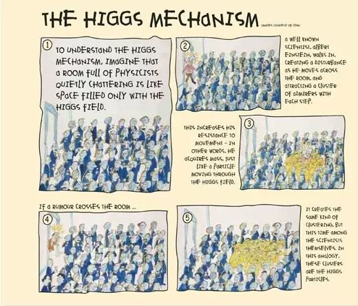 △ 希格斯机制:1. 一群物理学家聚在一个鸡尾酒派对中,他们安静的谈话着,就好比空间充满了希格斯场。2. 在某个时刻,爱因斯坦突然走进了派对之中,当他穿过人群的时候造成了小骚动,他的仰慕者纷纷向他靠拢。在走进房间之前,爱因斯坦可以自由的移动。3. 但是当他走进一个满是物理学家的派对时,他的移动速度变慢了,仰慕者使他难以行动。换句话说,他获得了质量。这就好比是无质量的粒子通过跟希格斯场作用而获得质量。4. 如果有一个谣言在人群中传播开来,同样造成了聚拢,但这次是物理学家自己。在这个类比中,聚拢的物理学家就是希格斯粒子。(图片来源:CERN)