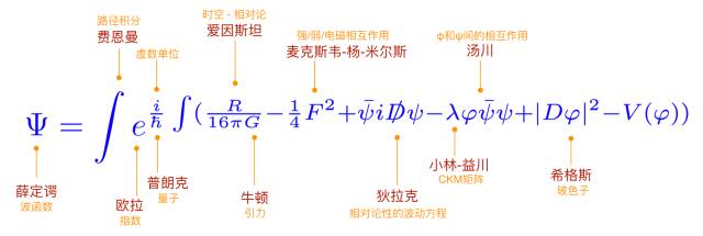 在公式的标注中,可以看到一些耳熟能详的大物理学家,比如薛定谔、费恩曼、爱因斯坦、牛顿、狄拉克等等。可以说,这个公式是真正的智慧的结晶。