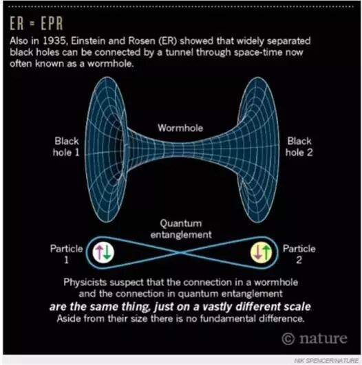 虫洞,也被称为爱因斯坦-罗森桥(即方程中的ER)。1935年,在爱因斯坦(E)与罗森(R)合作的一篇论文中首先提出虫洞。而方程的右边,EPR则是爱因斯坦(E)、波多尔斯基(P)和罗森(R)共同发表的另一篇论文。在这篇论文中他们首次提出了量子纠缠的概念。在过去几十年,从来没有人认真的思考过着两篇论文之间或许存在着某种联系。直到2013年,物理学家Juan Maldacena和Leonard Susskind提出在某种程度上,虫洞和纠缠是等同的,它们以不同的方式描述了同一个根本现实。