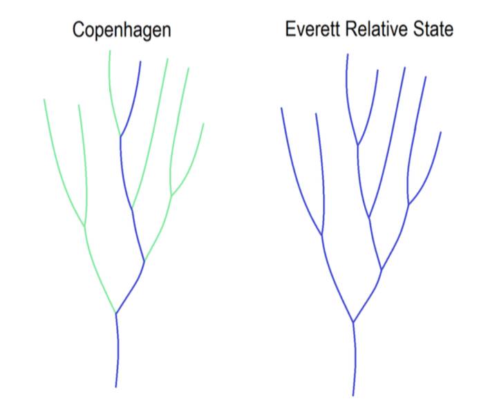 左边为量子力学的哥本哈根诠释,右边为多世界诠释(又称为相对状态提法或艾弗雷特诠释)。(© Leonard Susskind)