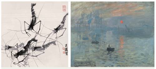 图1 齐白石的《墨虾》与莫奈的《日出·印象》(来自360百科及英文维基百科)