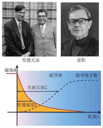 图6 (上)伦敦兄弟与皮帕;(下)超导体中伦敦穿透深度λ与皮帕关联长度ξ (来自英文维基百科及杜克大学物理系主页)