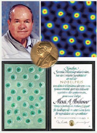 图8 (上)阿布里科索夫与他预言的量子化磁通格子;(下)诺贝尔奖纪念册(来自美国阿贡实验室主页)