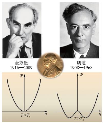 图7 (上)金兹堡与朗道;(下)二级相变唯象理论模型(来自英文维基百科)