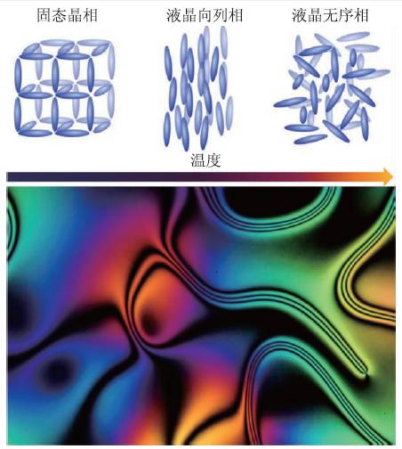 热力学相变实际上就是物质中无序态和有序态相互竞争的表现,系统从一种状态过渡到另一种状态,其无序度发生了改变,就称之为相变。一般来说,相互作用是有序的起因,而热运动则是无序的来源。冰融化成水, 水蒸发成汽,这对应着固体变成液体、液体变成气体的相变过程,水分子的无序度在不断增加。类似地,液晶是由棒状分子组成,在低温下形成规则有序的固态晶相( 近晶相), 温度升高会变成胆甾相、向列相等只有某些特定取向的排列,再升温就变成无序化的液相( 图3)。液晶的不同相对透射或吸收的光线有着不同的选择,正是由于这种独特性质才被广泛应用于电子显示屏。